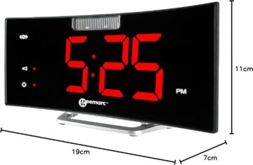 Das geschwungene Design (daher der Name „Curve“) macht den Wecker zu einem Blickfang auf dem Nachttisch. Die drei Helligkeitsstufen des Displays ermöglichen eine angenehme Nutzung auch nachts. Der integrierte USB-Anschluss dient zum Laden von Smartphones.